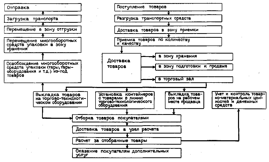 Торгово-технологический процесс в магазине представляет собой комплекс взаимосвязанных торговых (коммерческих) и технологических операций и является завершающей стадией всего торгово-технологического процесса товародвижения. На этой стадии к осуществлению торгово-технологического процесса товародвижения подключаются розничные покупатели, которые, в зависимости от применяемых методов продажи товаров, могут играть в нем весьма активную роль.