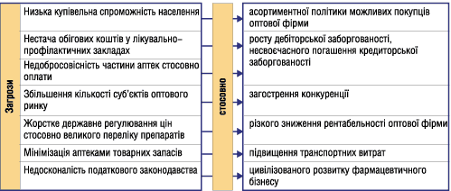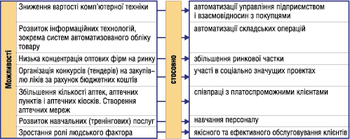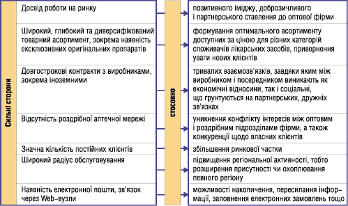 За результатами проведеного SWOT-аналізу встановлюємо, що досліджуване фармацевтичне підприємство має ряд сильних сторін і можливостей на фармацевтичному ринку. Їй можна запропонувати конкретні стратегії з потенціювання цих сторін і можливостей за умови врахування й обмеження впливу слабких сторін і загроз, що забезпечить фірмі конкурентні переваги. Наприклад, наявність електронної пошти, зв’язку через Web-вузли, зниження вартості комп’ютерної техніки та розвиток інформаційних технологій можна використати для оснащення дискримінованих за теорією портфоліо постійних покупців (аптек) групи А модемами, що у свою чергу сприятиме усуненню загроз з боку мінімізації товарних запасів в аптеках та збільшенню кількості суб’єктів оптового ринку.
