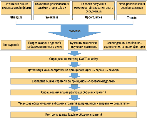 Таким чином, SWOT-аналіз є універсальним аналітичним інструментом, який може застосовуватися фармацевтичним підприємством як для вибору маркетингової політики розвитку, так і для ринкового аналізу та вивчення конкурентоспроможності.