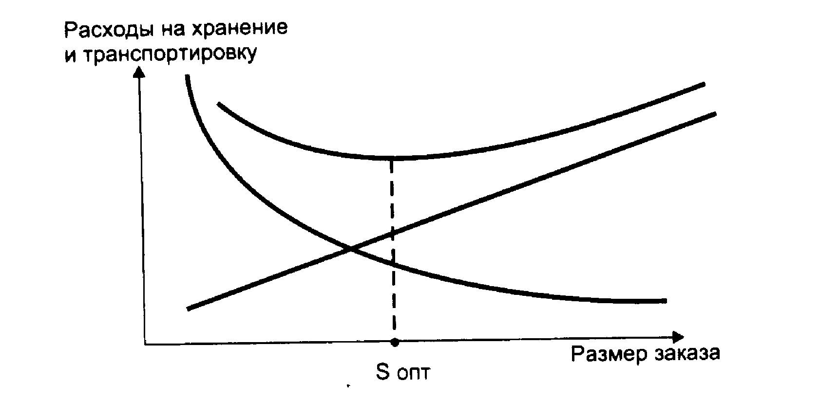 Сложив оба графика, получим кривую, отражающую характер зависимости совокупных издержек по транспортировке и хранению от размера заказываемой партии (рис. 3). Как видим, кривая суммарных издержек имеет точку минимума, в которой суммарные издержки будут минимальны. Абсцисса этой точки S>опт >дает значение оптимального размера заказа.