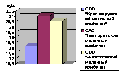 Из диаграммы можно увидеть, что касается цены на выпускаемую продукцию, то у предприятия «Краснояружское молоко» она меньше, чем у Белгородского или Алексеевского молочных комбинатов. Также цена, по сравнению с теми же конкурентами, меньше и на другую продукцию, производимую КМК, например на кефир или творог. Именно поэтому многие потребители и выбирают продукцию этого комбината.