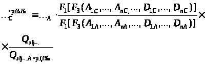 На даному етапі, при обліку розробок Л.А.Юрченка, представлених у виді виразу, і згруповані в загальному виді не залежно від класу і типу аналізованого устаткування за умови, що показники А>i> і С>i> символізують показники призначення, В>i> - показники технічного рівня, а D>i> - рівень експлуатації, то рівняння приймає наступний вид:
