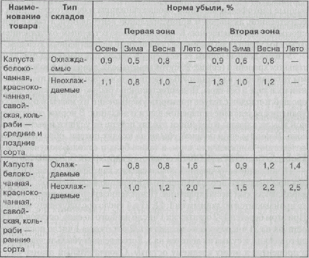 Фрагмент таблицы норм естественной убыли свежих картофеля, овощей и плодов при длительном хранении на базах и складах разного типа