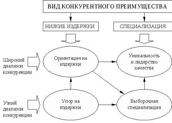 При этом в любой данный момент времени, строится стратегия обеспечения конкурентоспособности, опираясь лишь на один из видов конкурентных преимуществ – либо на более низкие издержки, привлекая покупателей относительной дешевизной товаров по сравнению с аналогичными изделиями других производителей, либо на специализацию, вызывая интерес у наиболее взыскательных и требующих, прежде всего, высокого качества клиентов.