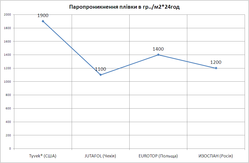 Рис.3.4. – Позіціонування товарів ТОВ «Дюпон-Україна» на конкурентному ринку за параметром «Паропроникнення плівки в гр../м2*24год»