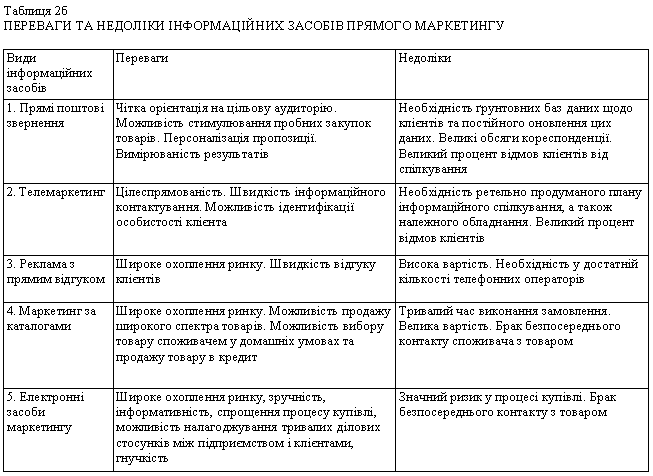 Прямий маркетинг — це надання комерційно важливої інформації про товари чи послуги безпосередньо цільовим споживачам з метою здійснення продажу. Останнім часом прямий маркетинг, як елемент комплексу маркетингових комунікацій, набрав особливого розвитку. Через властиві йому позитивні особливості. Це, зокрема: індивідуальний характер спілкування товаровиробника споживача; зручність процесів вибору і придбання товарів чи послуг; широкі можливості надання споживачу необхідної інформації; цілеспрямованість інформаційного впливу; можливість налагодження постійних ділових стосунків зі споживачами, вимірювання їхньої реакції на відповідні звернення; можливість отримання швидкої реакції ринку на зроблені комерційні пропозиції; висока оперативність створення інформаційних повідомлень та можливість їх коригування залежно від реакції споживачів. З-поміж засобів інформаційного спілкування найвідомішими в прямому маркетингу є такі: прямі поштові звернення, коли інформаційні матеріали (проспекти, брошури, прейскуранти тощо) надсилаються поштою безпосередньо споживачеві; телемаркетинг: спілкування зі споживачем здійснюється телефоном з використанням різноманітних телекомунікаційних та інформаційних технологій; реклама з прямим відгуком: реклама через газети, журнали, телебачення передбачає отримання підприємством-рекламодавцем безпосереднього відгуку споживача (запитання додаткової інформації чи конкретна пропозиція придбання товару); маркетинг за каталогами: продаж товарів за каталогами, які надсилаються споживачу поштою чи розповсюджуються через магазини; електронний маркетинг: продаж товарів через Internet, з допомогою кабельного чи супутникового телебачення. Переваги та недоліки інформаційних засобів прямого маркетингу наведено в табл. 26.