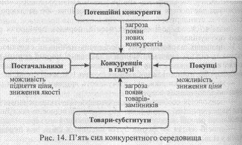 Згідно з теорією М. Портера аналіз конкурентного середовища доцільно проводити через вивчення дії п'ятьох його сил (рис. 14).