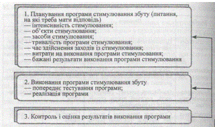 Як указано в таблиці, використання деяких засобів стимулювання збуту є досить коштовним. Тому програму стимулювання збуту треба ретельно спланувати. Алгоритм такої програми зображено на рис. 46.