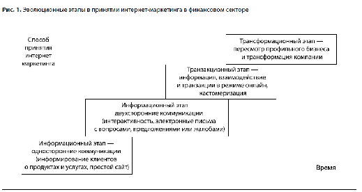 Компании, действующие в финансовом секторе, активно изучают и используют возможности Интернета. Процесс принятия новых технологий проходит через определенные стадии. Согласно Parsons et al. [17], существует четыре эволюционных этапа в принятии интернет-маркетинга (рис. 1).