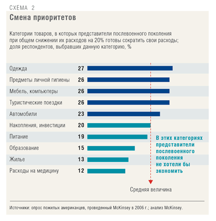 Зараз з-за різкого обвалу ринку нерухомості і цінних паперів багато «бебі-бумер» смутно собі уявляють, яким буде їх фінансове становище після виходу на пенсію, і тому вони не можуть підтримувати колишній спосіб життя. Їм доведеться докорінно переглянути свої пріоритети. Коли в 2006 р. ми проводили опитування серед людей цього покоління - нас цікавило, як зміниться структура їх споживання, якщо витрати знизяться на 20%, - то респонденти відповіли, що перш за все скоротять витрати на одяг, предмети особистої гігієни, меблі та туристичні поїздки , але не готові заощаджувати на харчування, житло і медицині (див. схему 2). Сильніше всього ці тенденції отразятся, наприклад, на виробників меблів або туроператорах, і першочерговим завданням для них стає пошук демографічних сегментів з кращими перспективами росту споживання.