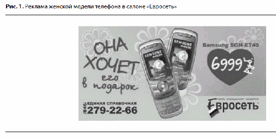Компании «Евросеть», наверное, проще, чем многим другим, делать гендерную рекламу, поскольку разные модели сотовых телефонов изготавливаются уже с учетом интересов определенной потребительской аудитории. Например, к 8 Марта компания подготовила специальную рекламу телефона Samsung: «Она хочет его в подарок» (см. рис. 1).
