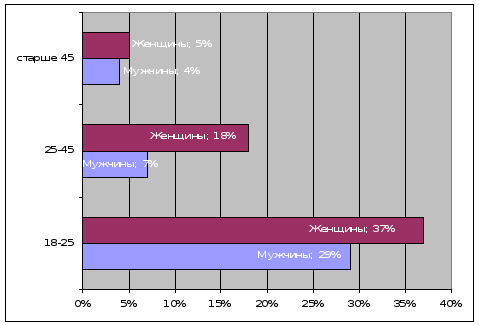 Данные рисунков 1-2 позволяют сделать следующие выводы: в обследование приняли участие 40 мужчин и 60 женщины различных возрастов и рода деятельности. Основная масса прошенных - это люди в возрасте от18 до 25 лет.