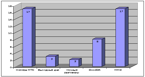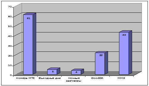 Из этой диаграммы мы видим, что наибольшей популярностью пользуется услуга "Номера МТС", на втором месте услуга "MMS".