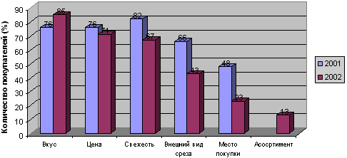 Как видно из рис. 1, производство колбасных изделий в России за последние 7 лет увеличилось в 2 раза. Анализ данных, приведенных на рис. 1, показывает снижение объемов производства колбасных изделий в период кризиса 1998-1999 гг., а затем их рост, начиная с 2000 г. По оценке ИТКОРа, объем производства в 2004 г. повысился по отношению к 1999 г. на 90%. В январе-сентябре 2004 г. выпуск колбасных изделий по отношению к аналогичному периоду 2003 г. вырос на 8% и составил 1354491 т7.