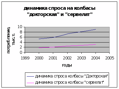 Рис. 1. Динамика объемов производства колбасных изделий за 1998-2004 гг.