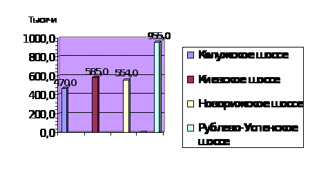 Как видно из таблицы 1, для анализа мы взяли 4 направления (Калужское, Киевское, Новорижское и Рублево – Успенское шоссе), которые с точки зрения инвестирования считаются наиболее перспективными. Все участки были подобраны по следующим показателям: разрешенное использование (назначение) – индивидуальное жилищное строительство, отдаленность от МКАД от 1 км до 20 км, наличие инженерной инфраструктуры – газоснабжение, водоснабжение, энергоснабжение, хорошие подъездные пути (асфальт). По выбранным ценам мы рассчитали среднюю стоимость земли за 1 сотку и представили полученные данные в диаграмме (рис. 1).