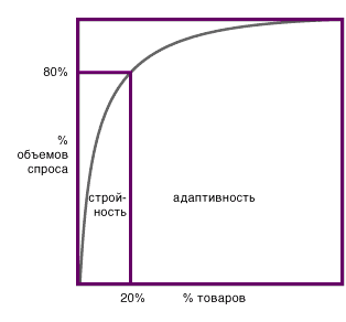 Множество компаний, производящих и распределяющих широкий спектр продуктов обнаружат, что закон Парето можно применять и использовать для определения логистической стратегии. В основном анализ показывает, что 80 процентов общего объема обеспечивается всего лишь 20% всего ассортимента. Способ управления этими 20 процентами вероятно должен быть весьма отличен от способа управления оставшимися 80 процентами. Например, можно доказать, что спрос на первые 20 процентов более точно предсказуем и предполагает использование стройных принципов производства и дистрибуции. Медленно оборачивающиеся 80 процентов, с другой стороны, будут вероятно, менее предсказуемы и потребуют более адаптивного способа управления. Рисунок 1 предлагает вариант дискретного способа разработки логистической стратегии для предсказуемых 20 процентов и для более непредсказуемых 80 процентов товаров: