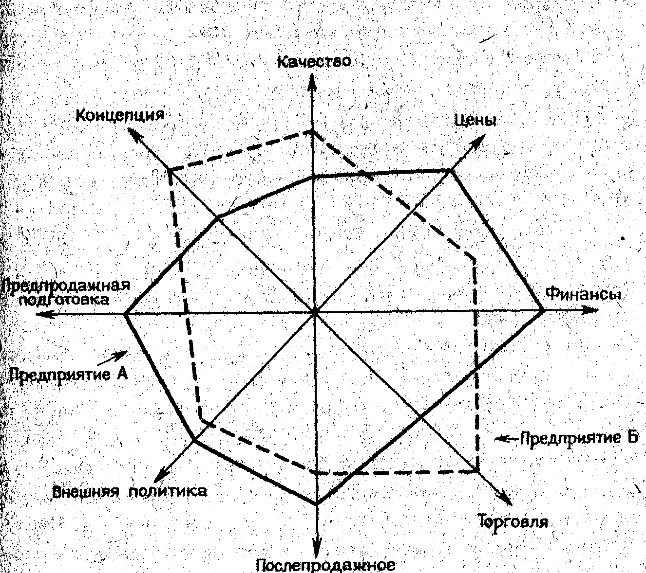 Оценка возможностей предприятия позволяет построить «многоугольник конкурентоспособности". Достаточно одинаково подойти к каждому конкуренту или к конкуренции в целом, чтобы провести сравнительный анализ конкурентоспособности. Накладывая схемы друг на друга, можно увидеть сильные и слабые стороны одного предприятия по отношению к другому (рис.).