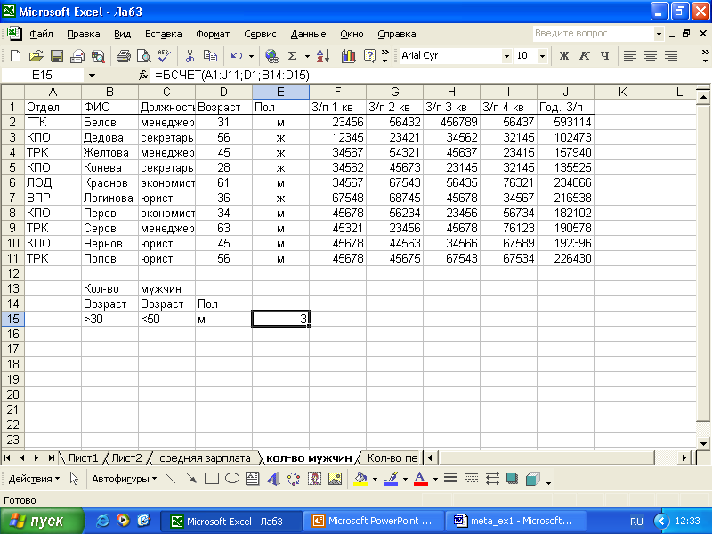 Вторым аргументом Поле задается заголовок столбца в двойных кавычках или число, представляющее номер столбца в списке. Третий аргумент – диапазон, содержащий задаваемые условия. Таким образом, Д-функция будет иметь следующий вид: ДСРЗНАЧ(A1:J11; D1; G21:G22). Аналогично надо поступить при вычислении среднего возраста мужчин, создав нужный критерий. Подсчитаем количество пенсионеров среди мужчин (пункт b)). Для этого нам понадобится критерий следующего вида: