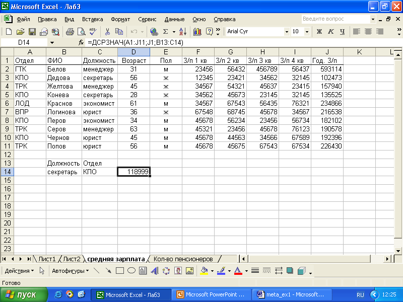 В пункте c) требуется подсчитать зарплату секретарей в отделе КПО (за год). Здесь опять будет двойной критерий, но по полям Должность и Отдел. Чтобы подсчитать среднюю зарплату воспользуемся Д-функцией ДСРЗНАЧ(). В качестве второго параметра Д-функции выступает столбец J, в котором определена годовая зарплата сотрудника (см. рис.11).