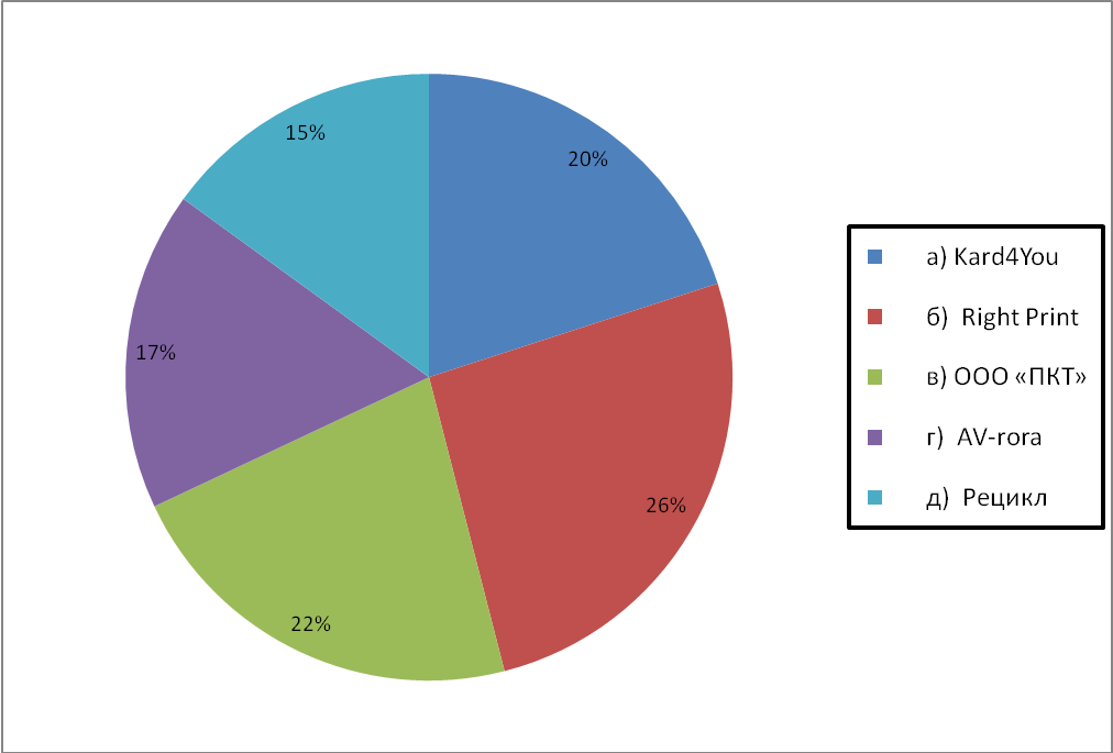 Для более глубокого конкурентного анализа было проведено маркетинговое исследование методом анкетирования. Объем выборки составил 100 респондентов, пользовавшихся услугами типографий, размещающих заказы на пластиковые карты на Интернет-форуме «Принтфорум», а именно Кard4you, Right print, AV-rora, Рецикл и ПКТ. Опрашивались респонденты , пользовавшиеся услугами вышеперечисленных организаций.