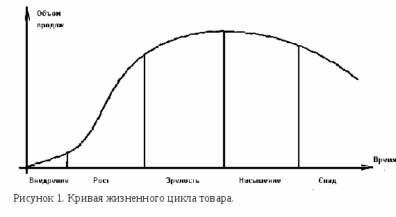 На рисунке 1 показана традиционная кривая жизненного цикла товара. Она описывает периоды внедрения, роста, зрелости, насыщения и спада. Конечно, график не является математически точными, он лишь схематически отображает жизненный цикл товара.