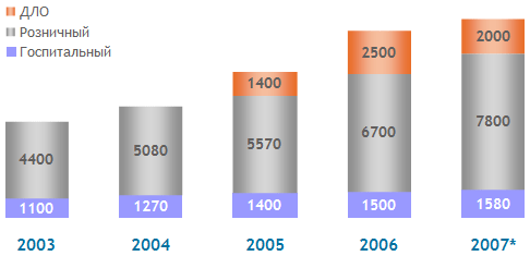 В настоящее время оптовая фармацевтическая сеть центральных регионов России характеризуется наличием двух секторов. Первый из них - это сеть крупных дистрибьюторов фармацевтической продукции (СИА Интернэшнл, ЦВ Протек, ООО "Биотек" и др.), изначально положивших в основу своего развития не только поведенческий подход (соперничество между продавцами/покупателями за более выгодную цену и рыночную нишу), но также и структурный подход, включающий маркетинговый анализ рынка, его сегментацию, происходящих в нем процессов и явлений, внедрение новых видов продукции, улучшение сервиса, продвижение товаров. Такие дистрибьюторы имеют прозрачную структуру сети (региональные филиалы, аптечные розничные сети), а, следовательно, и прозрачную (контролируемую) деятельность на фармацевтическом рынке.