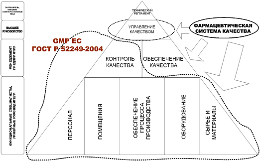 Если должна быть система, обеспечивающая выпуск продукции стабильно надлежащего качества, то этой системой необходимо управлять. При этом система включает как части производственного процесса и надлежащей производственной практики, т.е. относящиеся к функционированию процессов, так и части, относящиеся к управлению организацией и взаимоотношениям с заинтересованными сторонами, необходимость наличия которой вызвана современным развитием методологии качества и общей теории управления (менеджмента).
