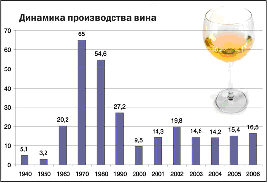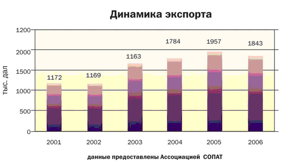 Помимо вышеперечисленных проблем украинского виноделия, вначале 2007 г. резко усилилась отрицательная динамика экспорта отечественных тихих вин. Так, за февраль-март 2007г. экспорт украинских вин в РФ составил 103 тыс. дал, в то время как за аналогичный период 2006г. — 204тыс. дал.