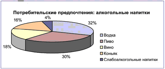 Как ни странно, будучи уместным практически во всех ситуациях, вино значительно уступает в популярности водке и пиву, оставаясь в сознании украинцев продуктом «для особого случая». Хотя справедливости ради стоит отметить, что в течение прошедших 10-15 лет у нас все меньше стали пить «огненную воду», а популярность вина постепенно увеличивается. И все же эксперты соответствующего международного рынка оценивают Украину как страну с низкой культурой потребления данного продукта. Так, украинец выпивает в среднем всего 4,5 литра вина в год. Для сравнения: среднестатистический француз - 40л, причем для Европы это не максимум, а средний показатель [диаграмма 3.2].