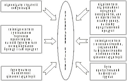 Отже, комунікативна концепція формулюється «від споживача» не навколо конкретного продукту, а навколо товарної групи чи імені бренду і повинна бути позитивною.