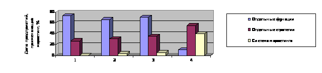 Как видно из сложившейся ситуации, менее гибкими в условиях развития рыночных отношений оказываются колхозы и совхозы. Более 70% хозяйств первой группы используют отдельные функции маркетинга, около 30% осуществляют маркетинговую деятельность, направленную на реализацию товарной и сбытовой стратегий, всю систему маркетинга не применяет ни одно сельскохозяйственное предприятие. Среди перерабатывающих и предприятий новых форм хозяйствования (акционерные общества, ассоциации, агрофирмы) систему маркетинга реализуют более 3%; почти треть функционируют на рыночных принципах. Тем не менее, большинство предприятий второй и третьей групп (более 65%) применяют лишь функции маркетинга.[2.c.7]