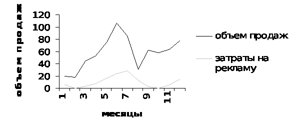 Рис.3.4 Динамика объемов продаж и затрат на рекламу в 2000 году