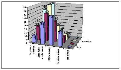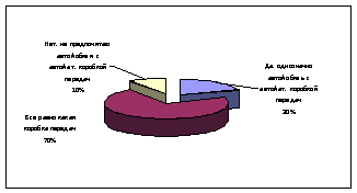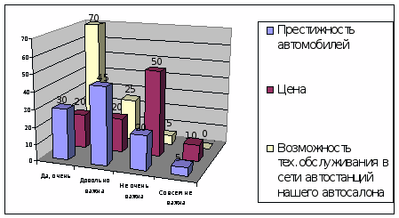 Предпочтения покупателей. По результатам вышеописанного опроса потенциальных потребителей можно сделать вывод о предпочтениях покупателей на российском рынке. Наибольшим спросом пользуются автомобили американских и европейских фирм, а именно седаны (для повседневного использования) и джипы (для отдыха и спорта). При этом для большинства потребителей не имеет значение, какая коробка передач в автомобиле (автоматическая или механическая). Довольно важна престижность автомобиля и возможность технического обслуживания в сети автостанций нашего автосалона; цена, напротив, не очень важна. В качестве дополнительной техники потребители считают довольно необходимыми телефон, магнитофон и холодильник, а бар желательным.