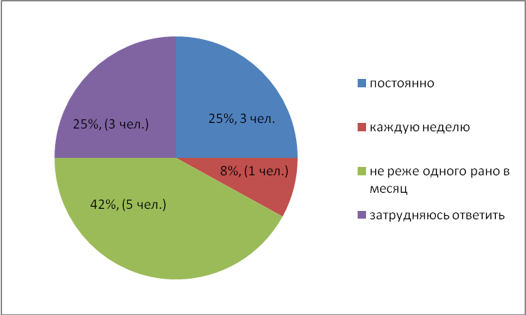 Большинство респондентов ответили, что данная проблема обсуждается в коллективе организации не реже одного раза в месяц – 42% (5 чел.), 25% (3 чел.) опрошенных ответили «постоянно», такое же количество респондентов (25%, 3 чел.) затруднились ответить на поставленный вопрос и, наконец, 8% (1 чел.) опрошенных ответили, что проблема имиджа и корпоративной культуры обсуждается каждую неделю. Данные, полученные по этому вопросу, говорят об осознании коллективом Калужского Дома музыки важности таких характеристик организации как имидж и корпоративная культура.