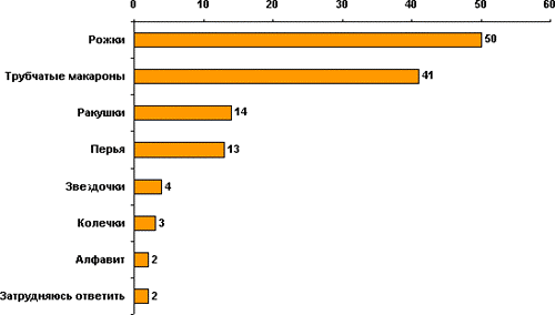 Несмотря на то, что существует достаточно широкий выбор различных видов макаронных изделий. Наиболее популярными среди населения видами макарон являются традиционные рожки и трубчатые макароны (50% и 41% соответственно). Также хорошим спросом пользуются «перья» и «ракушки» (см. рис. 2):