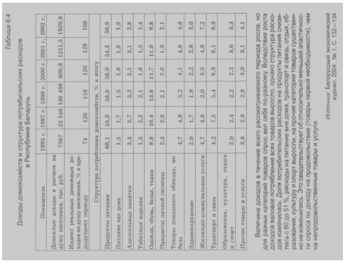 Ш Рассмотрим зависимость между доходами потребителей и их спросом на примере Республики Беларусь. В табл.6.4 приведены данные о денежных доходах домохозяйств страны в разные годы и сведения о структуре потребления домохозяйств. Так как ценовые показатели значительно колебались вследствие инфляции и действия других факторов, нас интересуют процентные изменения реальных доходов потребителей и изменения структуры отребления.