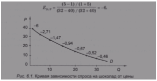Воспользуемся гипотетическим примером зависимости спроса от цены на рынке шоколада из предыдущей главы и рассчитаем ценовую эластичность спроса по цене (табл.6.1 и Рис.6.1).