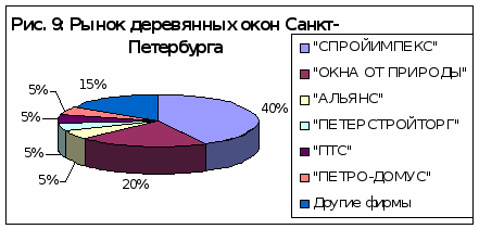 На рынке деревянных окон из массива сосны в Санкт-Петербурга в данных момент работают примерно 15 фирм. Неоспоримым лидером является компания "СТРОЙИМПЕКС" (примерно 40% рынка). Следующую позицию занимает фирма "ОКНА ОТ ПРИРОДЫ" (около 20%). За ними идут с гораздо меньшими долями рынка компании "АЛЬЯНС", "ПТС", "ПЕТЕРСТРОЙТОРГ", "ПЕТРО-ДОМУС", "СТИЛЬ" с примерно равными долями 5%. Оставшиеся 15% делят между собой остальные 10 фирм. Таким образом рынок в Санкт-Петербурге поделен, как отображено на диаграмме.
