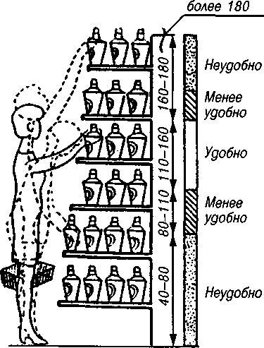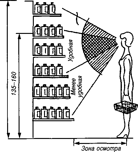 "Заметный товар чаще всего становится выбором покупателя, особенно большое значение имеет полка, на которой расставлен продукт. Многочисленные исследования показывают, что средние полки, расположенные на уровне глаз посетителя, способствуют максимальным продажам, в народе мерчандайзеры называют такие полки золотыми, именно за них и разворачивается борьба, но поговорим об этом несколько позднее. Полки, находящиеся выше уровня глаз, имеют показатели продаж ниже, чем средние, и называются серебряными. Соответственно, самые нижние полки обречены, они занимают третье место по выигрышности размещения." (Таборова Л.Г.,2009,60). Наиболее удобной зоной выбора товаров является зона попок, расположенных на высоте 110 - 160 см над уровнем попа. Менее удобными зонами выбора товаров являются зоны попок, расположенных на высоте 80 - 110 см (нижняя) и 160 - 180 см (верхняя) от уровня пола. (См. Приложение 1). С учетом такого зонирования полок оборудования производится выкладка отдельных товаров. Товары на оборудовании следует размещать таким образом, чтобы его демонстрационная площадь была использована полностью и товары занимали максимум пространства между полками. Чем большая масса товаров расположена на оборудовании, тем лучше они реализуются.