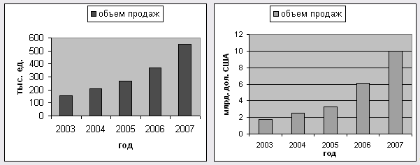 В 2006 году рынок новых легковых машин вырос до $6,1 млрд. — на 85%. Наибольшие темпы прироста продаж автомобилей в 2006 году имели место в мае-июне, что свидетельствует о зависимости автомобильного рынка от сезонного фактора. Таким образом, в течение 2006 года автомобильный рынок Украины демонстрирует значительные темпы роста, в частности, было реализовано 371 тыс. автомобилей что на 40% превышает показатель 2005 года. В 2006 году на автомобильном рынке Украины наблюдалась тенденция к увеличению спроса на автомобиле среднего и высокого ценового сегментов в сравнении с 2005 годом, что стало возможным благодаря росту доходов населения и развития автокредитования. За 2007-й, по данным Международного автомобильного холдинга "Атлант М", только на иномарки в Украине потрачено около $8,5 млрд. (на 65-70 % больше, чем годом раньше). Весь рынок новых легковых авто в этом году увеличился до $10 млрд. (+64 % в сравнении с 2006-м), украинцы купили почти 550 тыс. легковых автомобилей (+49 %) (рисунок 2.1) [23].