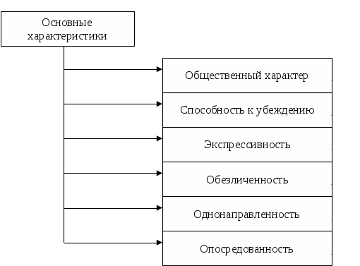 Реклама как массовая коммуникация обладает следующими характеристиками: общественный характер, способность к убеждению, экспрессивность, обезличенность, однонаправленность, опосредованность.