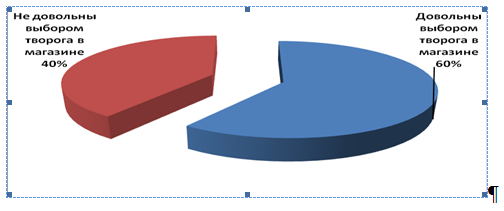 Выбор ассортимента творога в магазине также показал интересные результаты. С перевесом в 10%, наши потребители все-таки довольны выбором продукции творога в магазинах. Но то что 40% не довольны, это тоже имеет большое значение для того чтоб реализаторы задумались над этим.