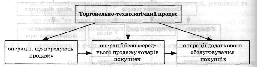 Залежно від методів продажу структура і послідовність виконання операцій та схеми торговельно-технологічних процесів можуть бути різними (рис. 1). Найбільш трудомістка схема — у магазинах, які застосовують традиційний метод продажу товарів — через прилавок обслуговування. При організації роботи за методом самообслуговування деякі торговельно-технологічні операції виконуються покупцями, що призводить до зменшення кількості операцій в торговому залі й спрощення схеми.