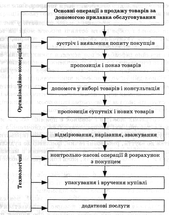 Продаж товарів за допомогою прилавка обслуговування здійснюють продавці. Основні операції, які виконуються за цим методом, можна умовно поділити на організаційно-комерційні та технологічні. До організаційно-комерційних операцій належать: зустріч і виявлення попиту покупців; пропозиція і показ товарів; допомога у виборі товарів і консультація; пропозиція супутніх і нових товарів. Основні технологічні операції: відмірювання, нарізання, зважування, розрахунок з покупцем, упаковування і вручення купівлі (рис. 4.3.6).