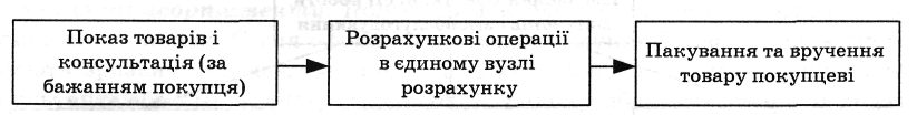 Таким чином, процес продажу товарів у торговому залі магазину самообслуговування можна зобразити схематично (рис. 8).