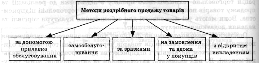 У системі магазинної форми обслуговування розрізняють такі методи роздрібного продажу товарів: продаж товарів за допомогою прилавка обслуговування, самообслуговування, продаж товарів з відкритим викладенням, за зразками, на замовлення та вдома у покупців (рис. 5).