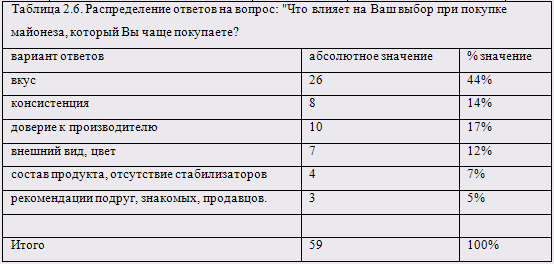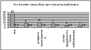 Наиболее важными факторами при выборе майонеза являются вкус, жирность и цена. Вкус – это одна из наиболее важных характеристик, составляющая имидж и определяющая марочные предпочтения. Жирность и в то же время соответствие цены тоже не маловажна для потребителей.