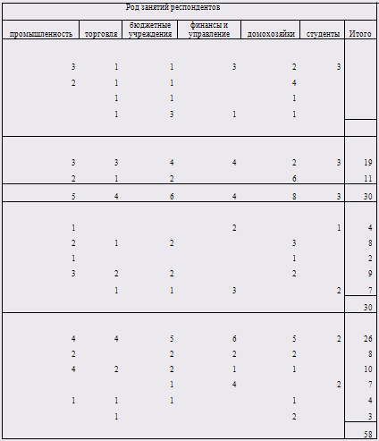 В приложении 2 представлено перекрестное табулирование. Предметом интереса здесь является выявление профиля по половозрастным критериям и роду занятий.