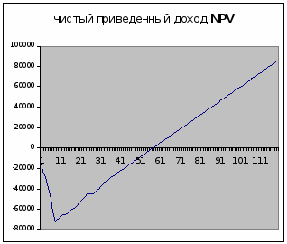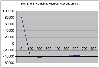 Значение внутренней нормы рентабельности IRR определяется величиной ставки дисконтирования, при которой кривая NPV (синий график) пересекает горизонтальную ось